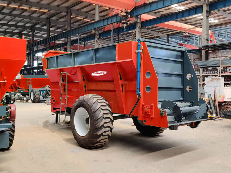 送肥系统由拖拉机液压输出驱动液压马达工作,通过送肥装置使得整箱肥料同步后移;撒肥系统由拖拉机动力输出轴驱动,通过旋转的破碎轮将肥料打碎并抛撒出去。